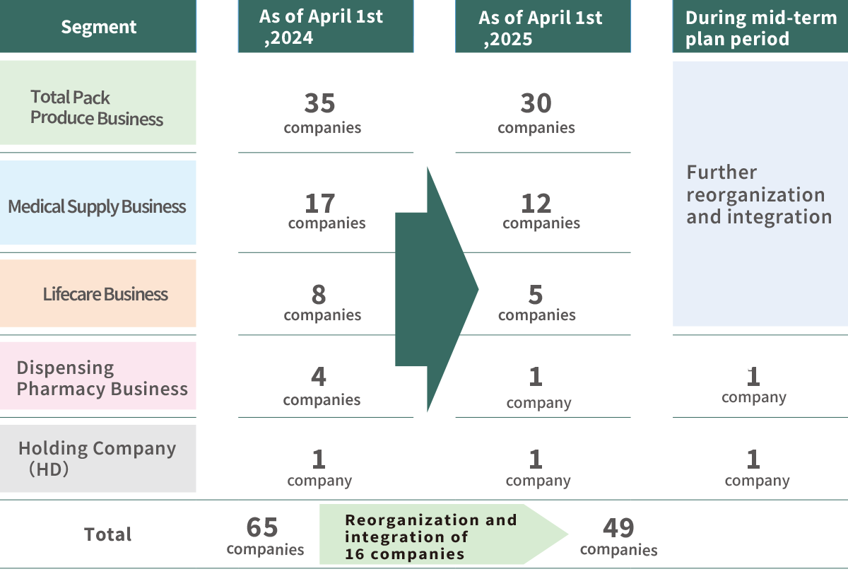 We have engaged in aggressive internal Group reorganization and integration to be the leader Group in the Japanese healthcare industry under the severe business environment. As a result, as of April 1, 2024, 16 out of 65 Group companies had been successfully integrated, with the nursing care and pharmacy-related businesses consolidated into a single entity respectively. We continue to advance reorganization and integration to further enhance the promptness of management and to further utilize management resources efficiently during the period of the new medium-term management plan.