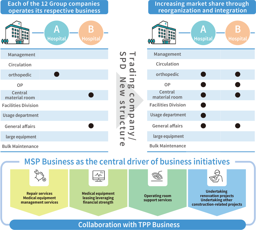 Personnel and materials expenses account for approximately 80% of hospital expenditure, making their management a critical issue in hospital operations. Medical Supply Business, being deeply integrated with daily hospital activities, allows us to offer detailed operational improvement proposals, IT support, and comprehensive outsourcing services. In addition, we advance reorganization and integration to gather information of various businesses. We set up a system for expanding this information to other segments including Total Pack Produce Business. We will expand this segment further, while simultaneously Reorganization to function as a hub for business intelligence. This intelligence will be leveraged across the Group, including in our Total Pack Produce and other segments, to support Group-wide growth and integration.